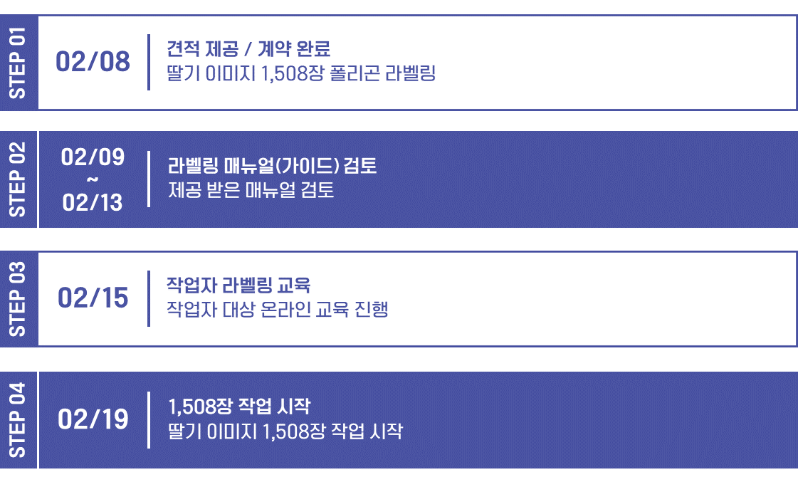 안녕하세요 비디와이드입니다. 2월 20일에 시작된 딸기 라벨링의 1차 작업이 모두 완료되었습니다. 공급사에서의 검수 과정만 남아있는 상황으로 2차 수정 보완 작업이 마무리 되면 최종적으로 프로젝트가 종료될 예정입니다.
